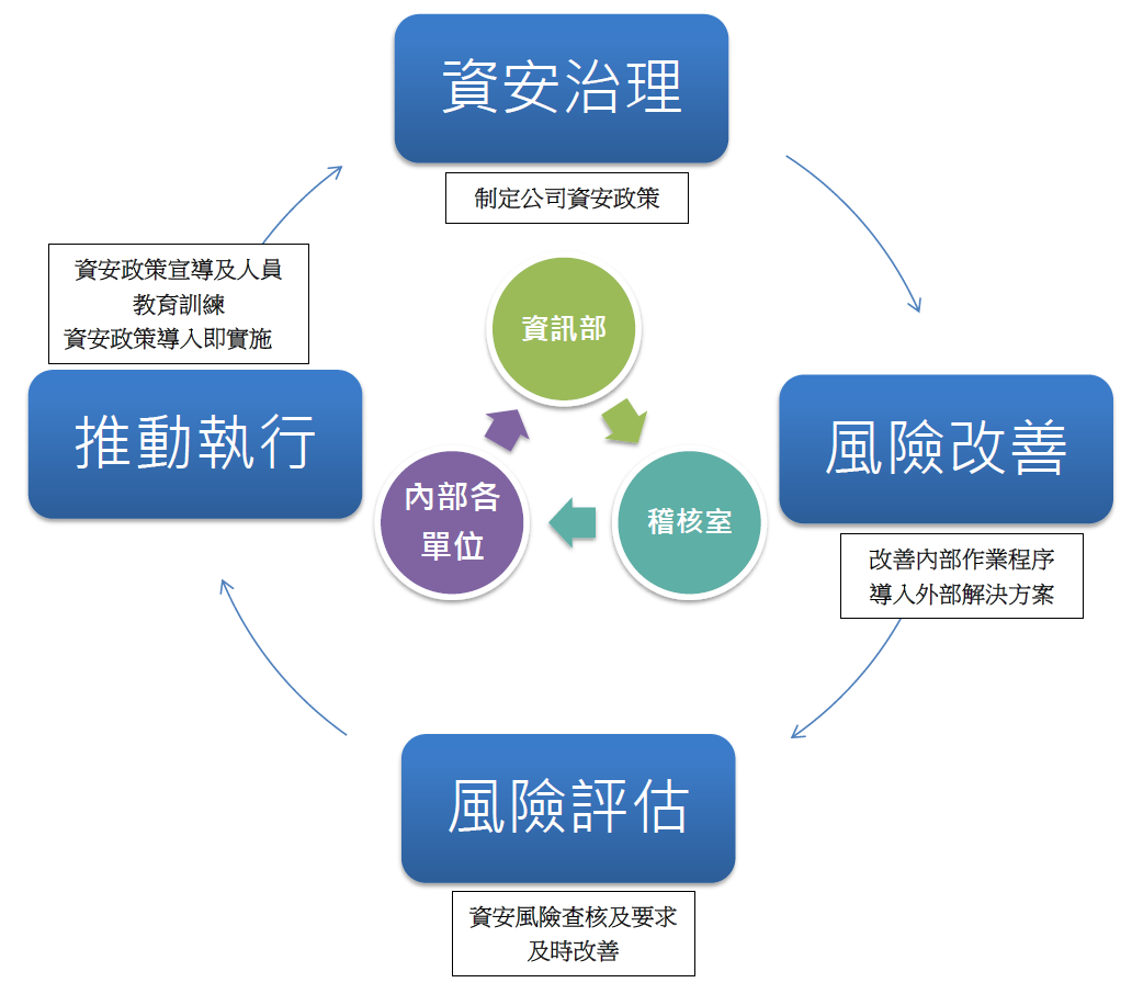 組織運作模式:資訊部制定公司資安政策及資訊安全作業程序,內部各單位推動執行並加強宣導資安政策及資訊安全作業程序及人員教育訓練,落實資安政策的導入及實施,稽核室進行資安風險查核,如發現缺失,要求受查單位提出相關具體改善作法,且定期追蹤改善成效。
